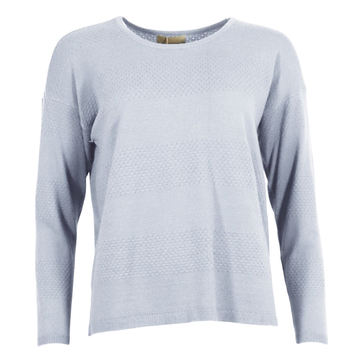 Blusen har en smuk lyseblå farve. Der er rund hals og lange ærmer, som afsluttes af en smal ribkant. Der er et fint og enkelt boblemønster i brede striber hen over blusen.
