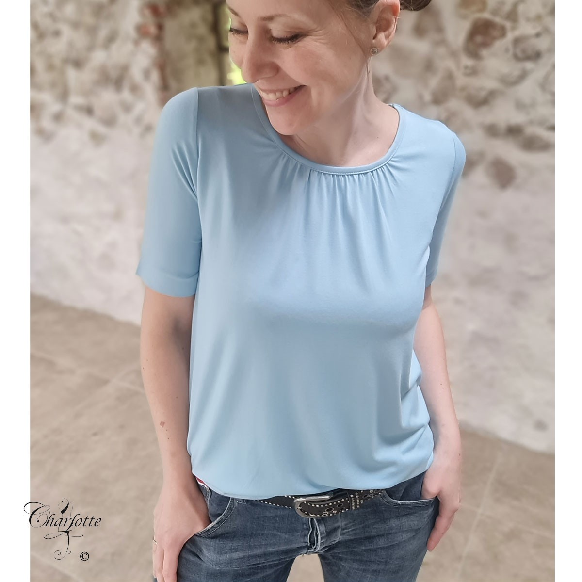 T-shirten har rund halsudskæring med små rynk foran samt hen over ryggen. Der er korte ærmer, og blusen har elastik forneden.