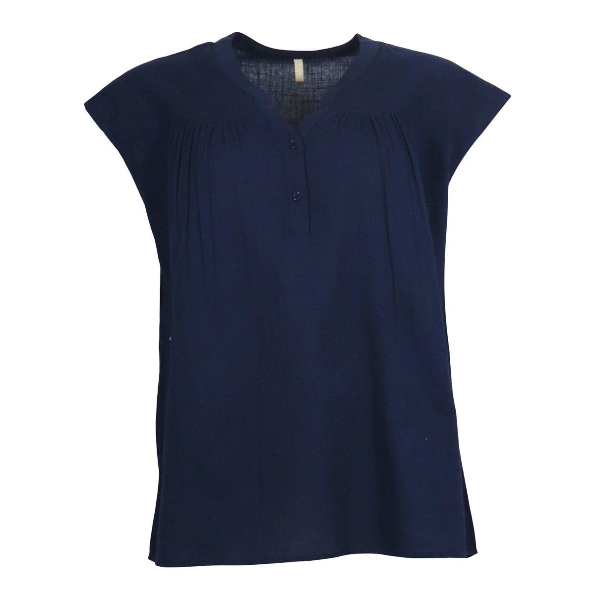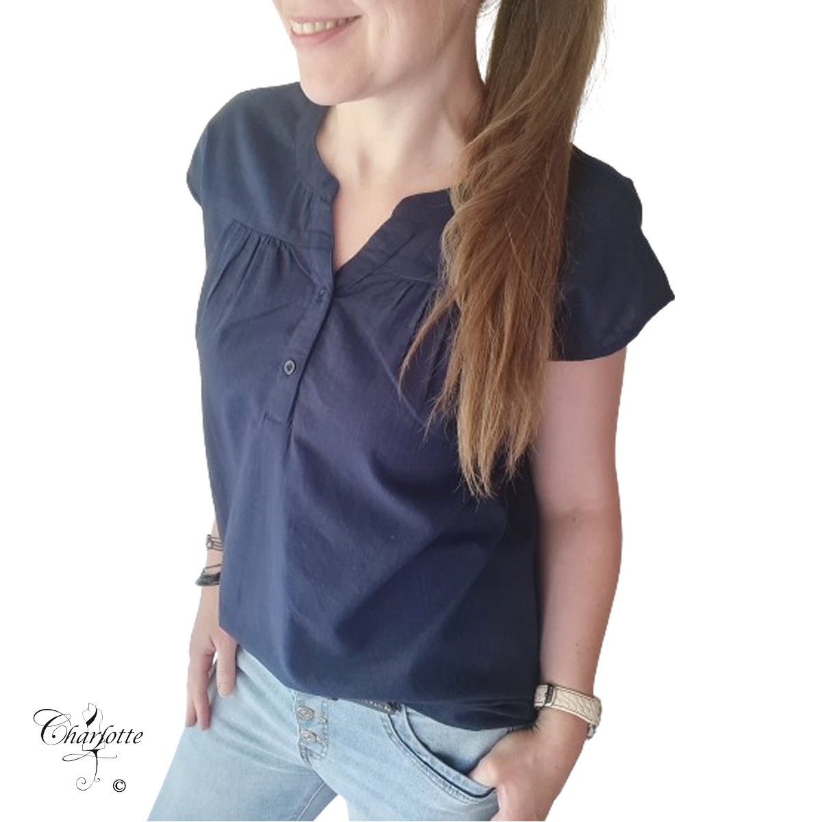 Blusen har V-hals og knappes foran af 2 små knapper til ned midt for. Der er små vingeærmer, der skærer overarmen på skrå og får den til at syne mindre. Over barmen og hen over ryggen er der små rynk, som er med til at sikre en super pasform til blusen.