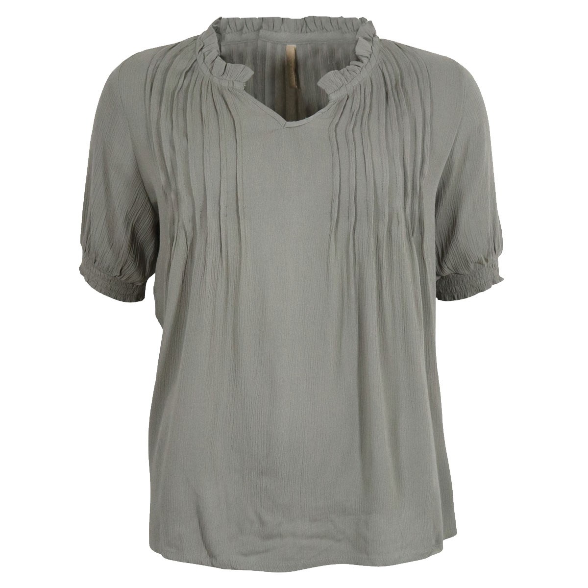 Blusen har V-hals med en lille flæsekant i nakken. Der er korte ærmer, der afsluttes af en let smocksyet elastisk effekt. Foroven både foran og bagpå er der små smalle læg, som er med til at give en super flot pasform og god bevægelighed.