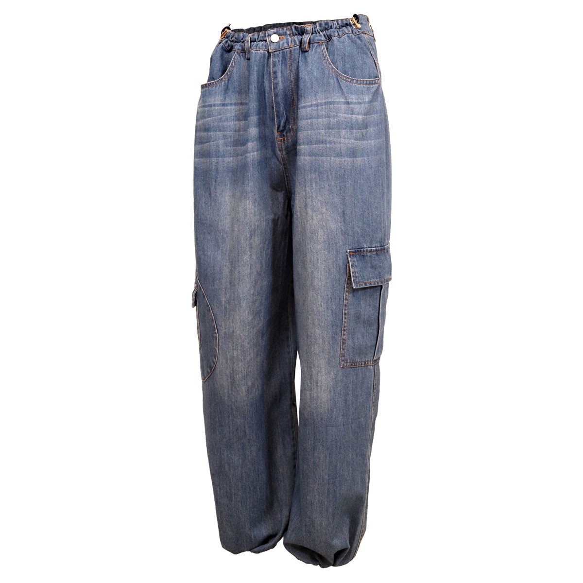 Buksen har en flot vasket denim farve. Der er fast linning og buksen lukkes foran af knap og lynlås. Foran er der mulighed for at rynke buksen til i taljen med en elastik. Der er bæltestropper i linningen, 2 skrå forlommer og 2 baglommer. Ved siden er der lårlommer. Buksen har elastikbånd forneden i benene, så man har mulighed for at stramme dem lidt ind - ellers er buksen bred forneden.