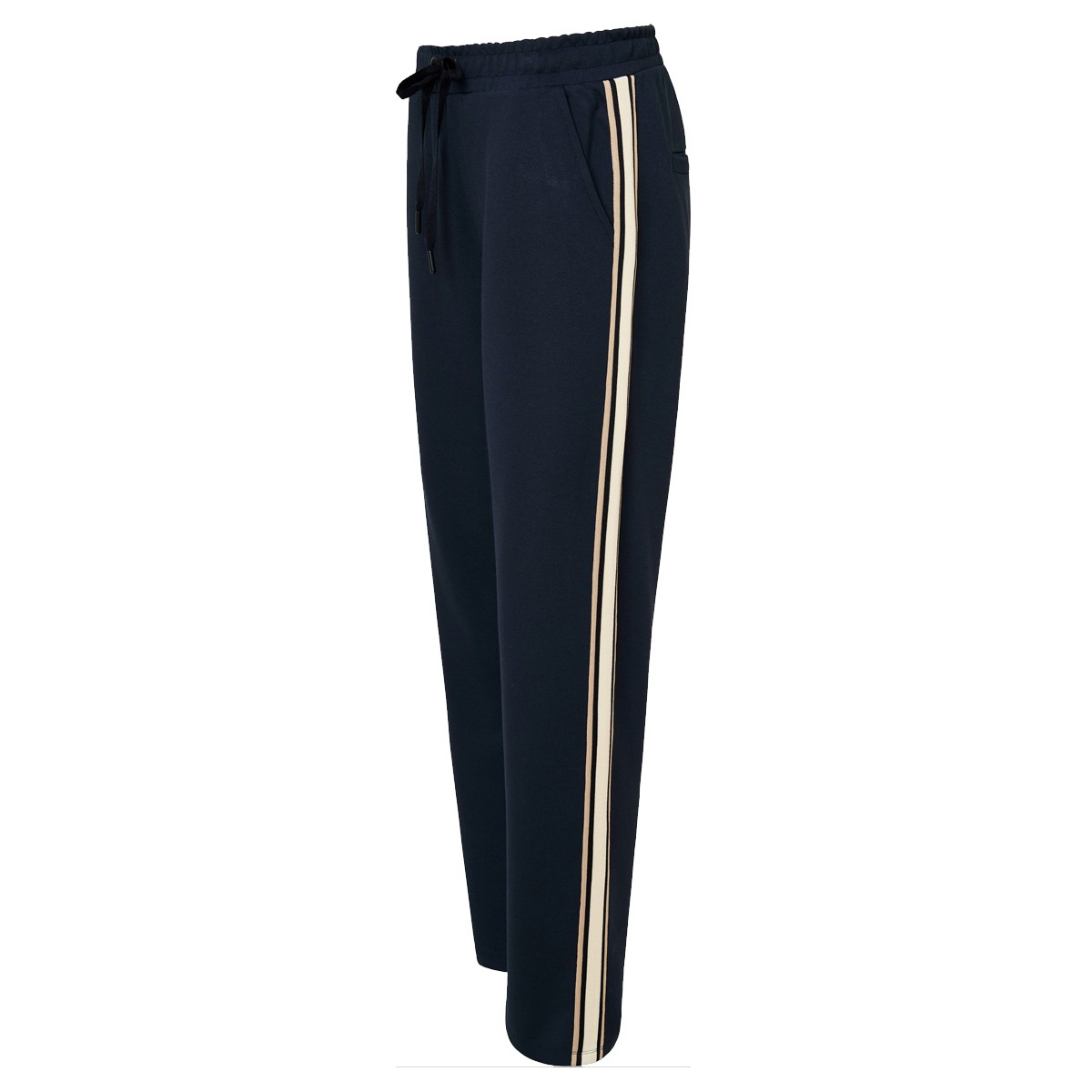 Buksen har en super flot mørkeblå nuance med et påsyet bredt kantbånd ned langs siden i creme, sand og navy.