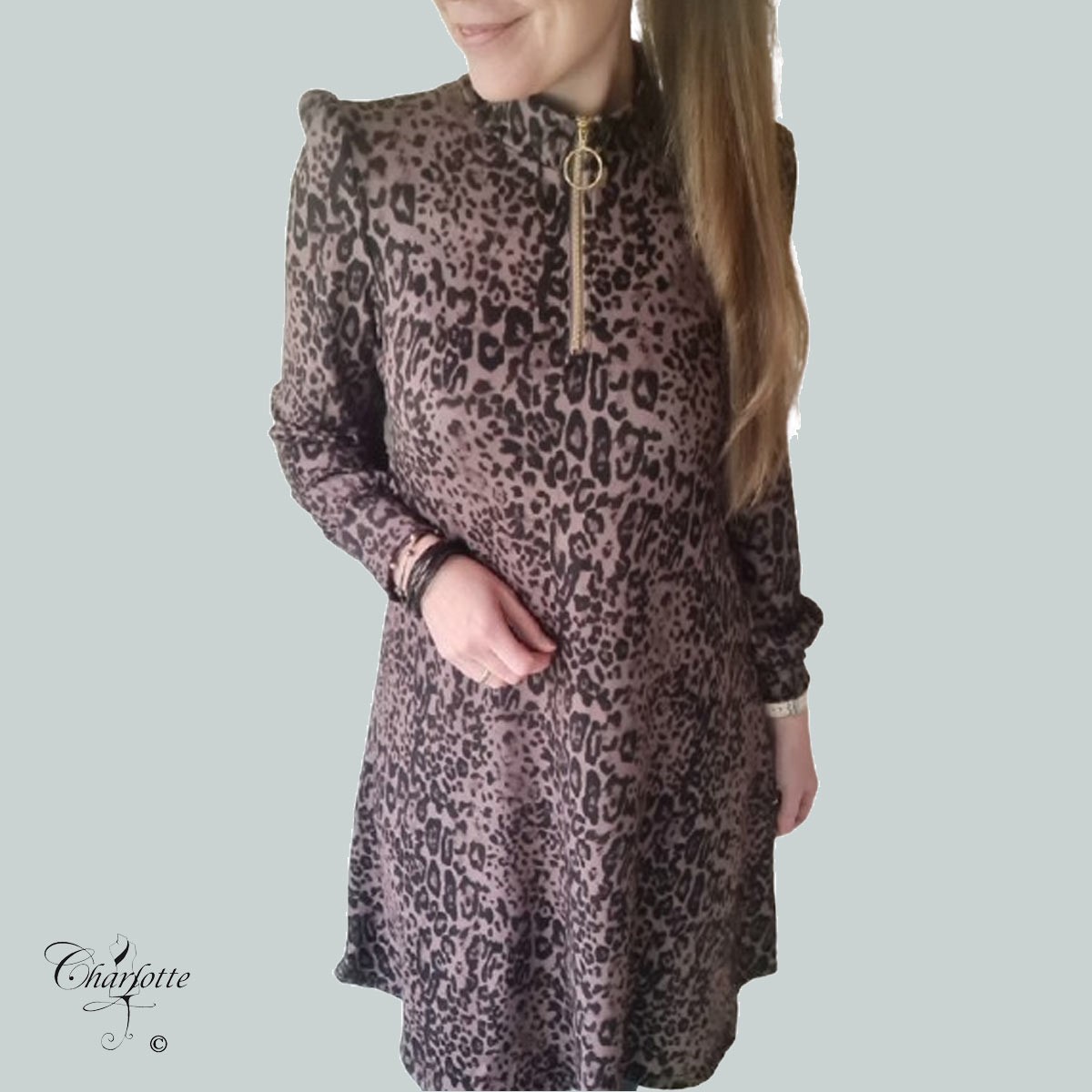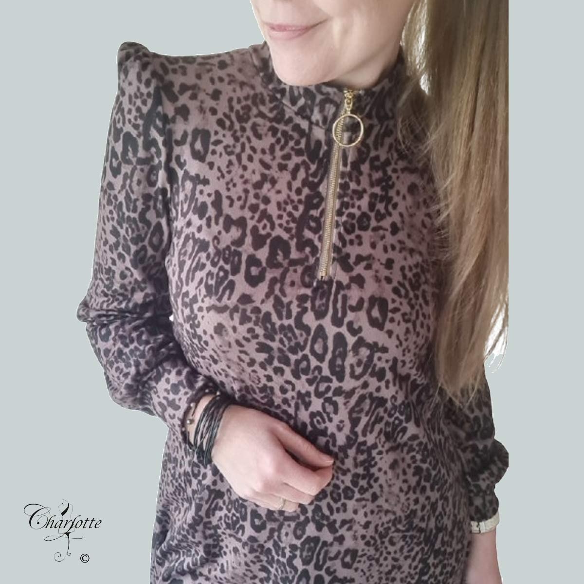 Kjolen har et flot mønster i dyreprint i smukke brune toner. Der er en høj krave med lynlåsåbning til midt foran. Der er lange ærmer med et lille feminint puf ved skulderen - ærmerne afsluttes af en bred manchet med små rynk. Kjolen er lidt længere bagpå end foran og svajer blidt op i siderne.