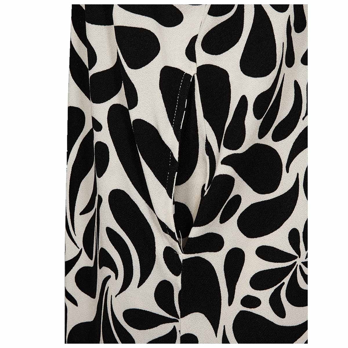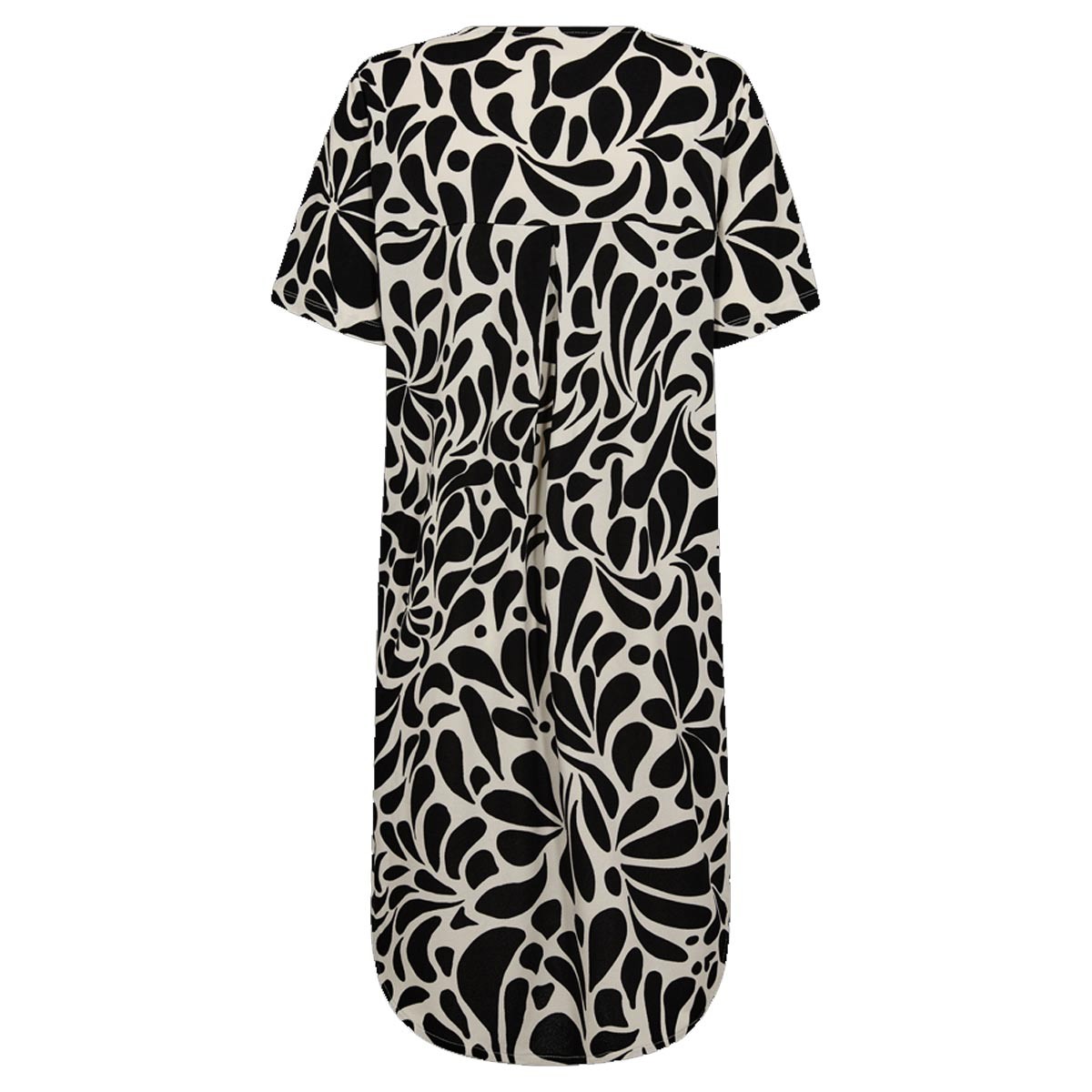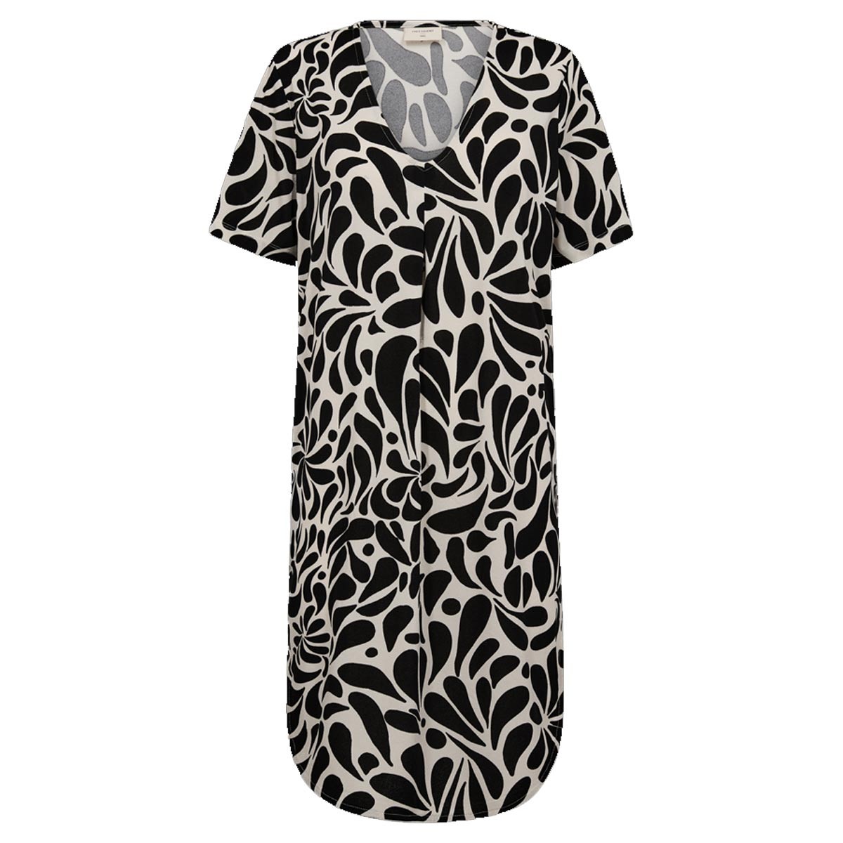 Kjolen er lys sandfarvet i bunden og har et super lækkert all over print i sort. Der er V-hals og korte ærmer. Både foran og bagpå er der et lille læg som giver en god vidde til kjolen. Der er 2 skjulte sidelommer og slids i siderne.