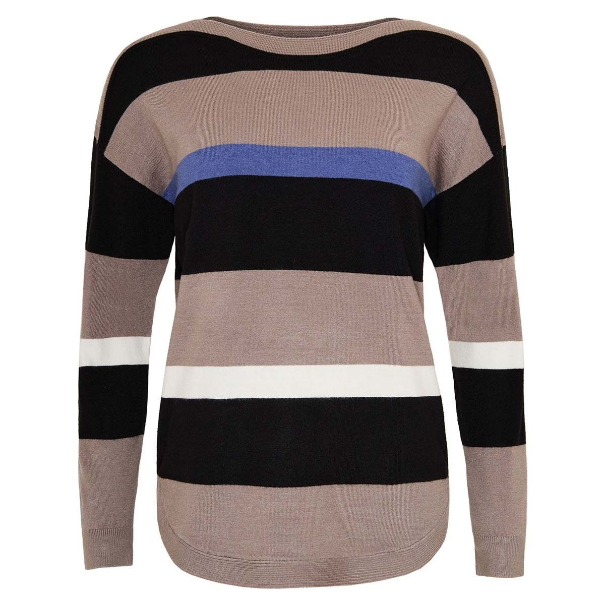 Strikken har brede sandfarvede og sorte striber samt en smal blå og hvid stribe. Der er rund bådformet hals og lange ærmer. Ved halskant og ud på skulderen samt forneden er der strikket små riller - en super sød detalje. Den runder flot forneden og buer op i siderne til slids.