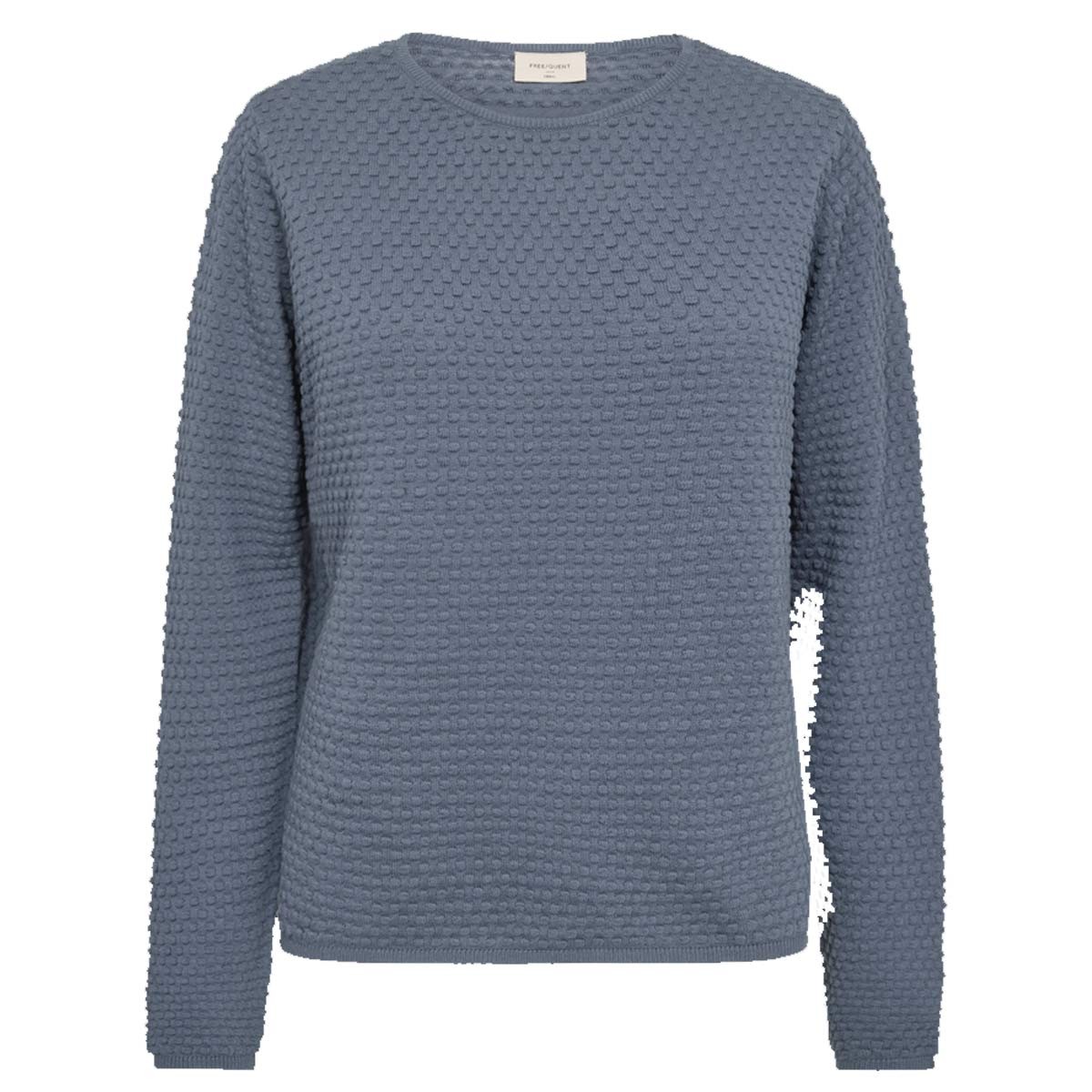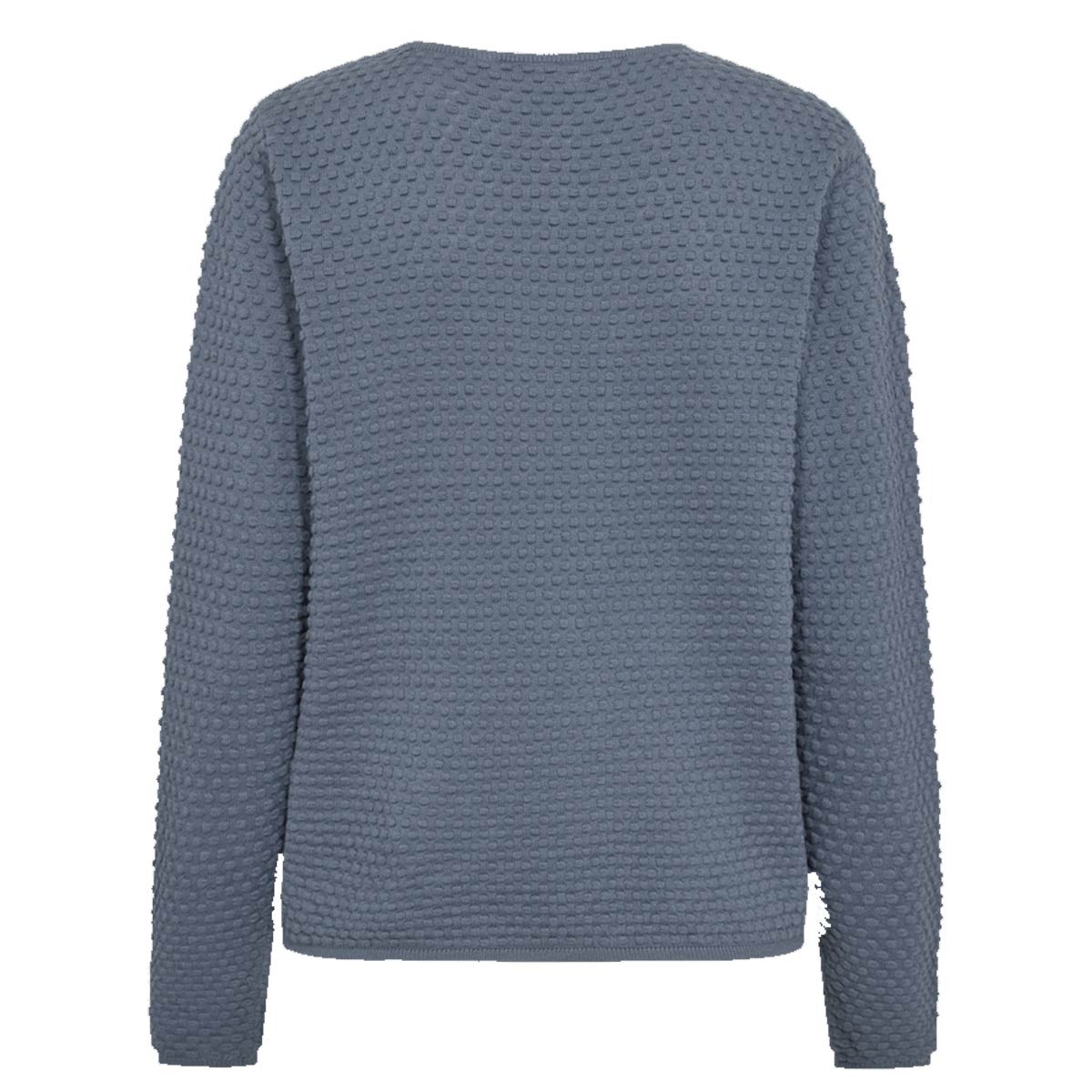 Strikblusen har en skøn mellemblå nuance med boblemønster, der giver en flot struktur. Der er rund hals og lange ærmer. Blusens kanter er helt fint ribstrikket. Så lækker!
