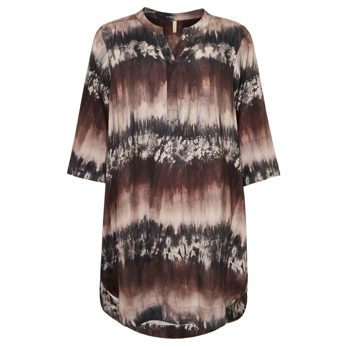 Tunika-kjolen har et lækkert batikmønster i smukke grå-brune og sandfarvede nuancer. Der er V-hals med stolpelukning foran til midt for. Foroven ved skulderen samt hen over ryggen er der små rynk. Der er 3/4 lange ærmer. Tunika-kjolen har lommer i siden. Den er lidt længere bagpå end foran og runder flot op i siderne til slids.